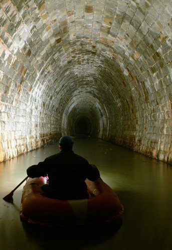 Zatopený úsek tunelu jsme se pokusili překonat na člunu