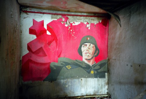...a na každé volné stěně politická výzdoba. Hm... trochu se ten sovětský voják podobá nacistickému vojákovi